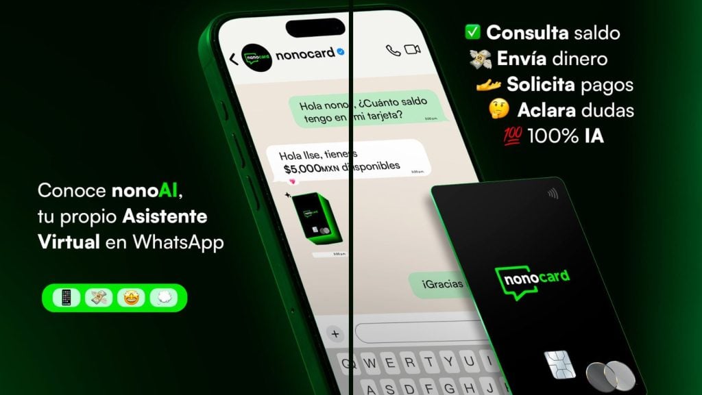 - Opera con IA desde Whatsapp: Una de las ventajas destacadas de este plástico, es que te permite realizar operaciones simples desde whatsapp. Puedes pagar tu tarjeta, recibir recordatorios, pagar servicios y más, sólo escribiendo al chatbot de NonoCard.